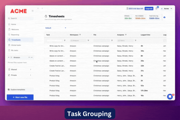* **Task Grouping:** You can now group tasks, where all time clocked in subtasks will be neatly mentioned underneath the main task. No more confusion with generic log names like "log 1" and "log 2" – you'll now know exactly which task each log belongs to. This will help you perform pivot tables and other operations on CSV exports a lot better, without fretting over pairing subtasks with their parents. Of course, if you wish for a group-by-task setting way to look at your timesheet, you can choose that option from the drop-down instead.&#x20;